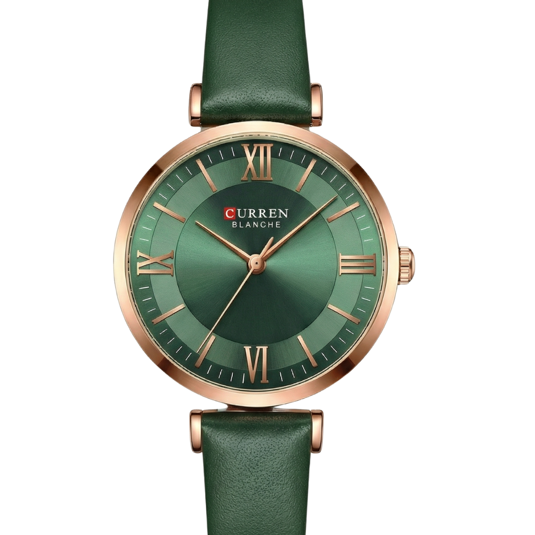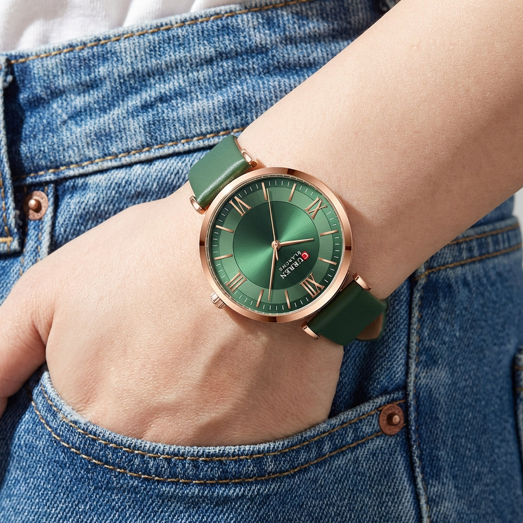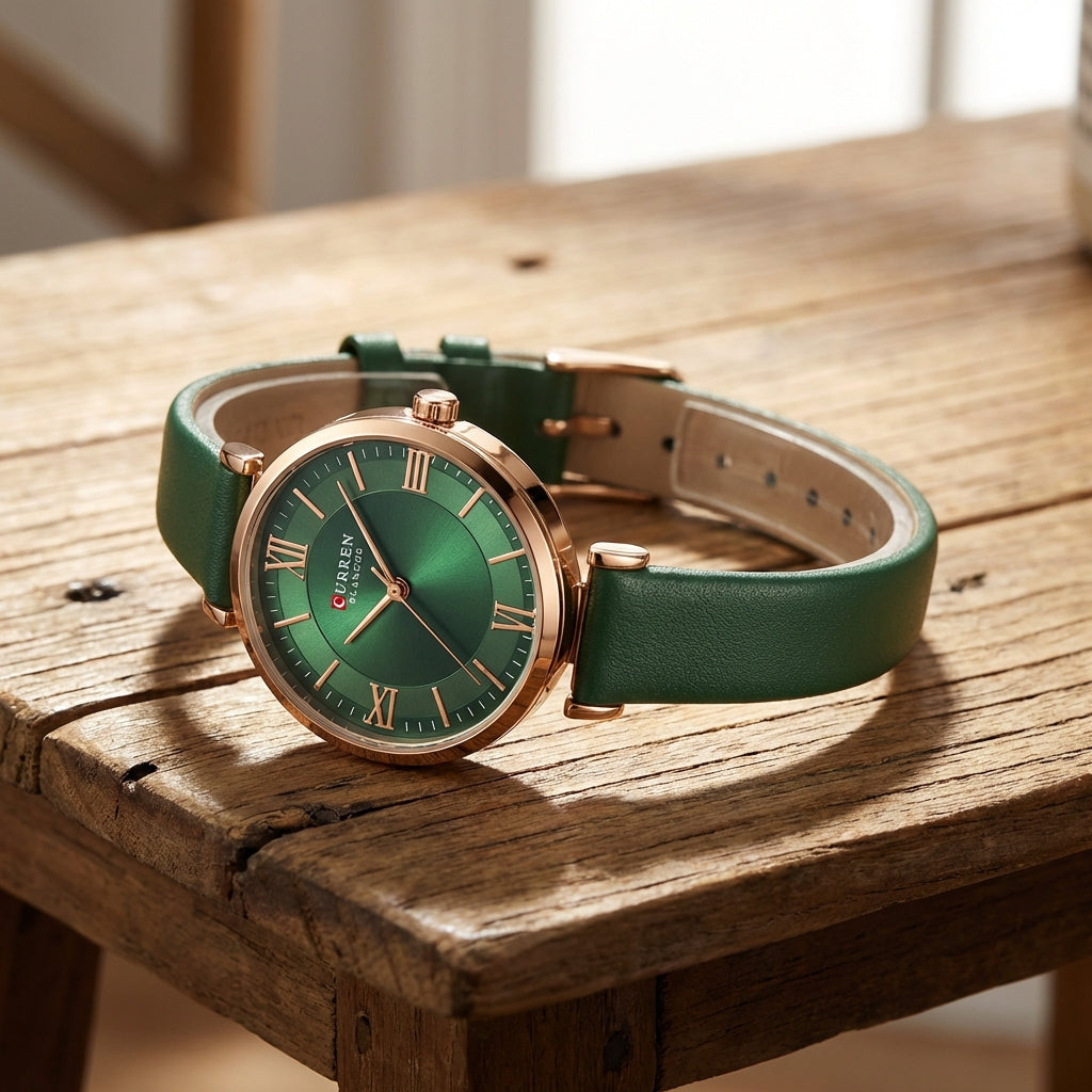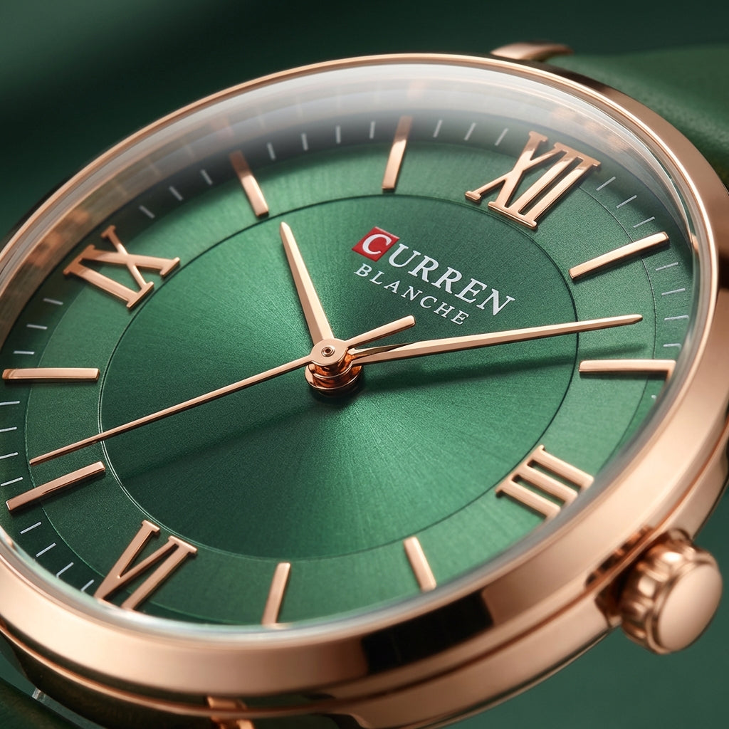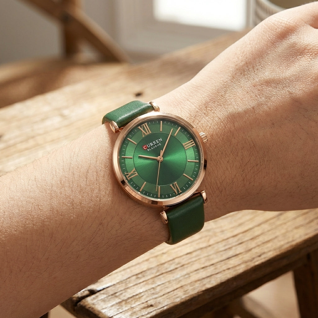 Designed with elegant distinction, this timepiece blends a rich emerald dial with refined rose-gold accents for a look that feels both modern and timeless. The Roman numeral markers add classic charm, while the slim profile and smooth leather strap ensure effortless comfort. Sophisticated yet versatile, it’s crafted to make a subtle statement wherever you go.