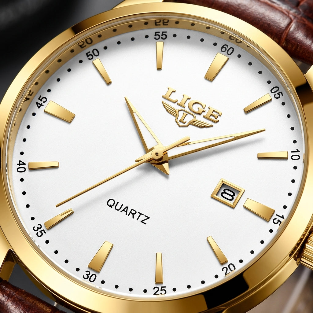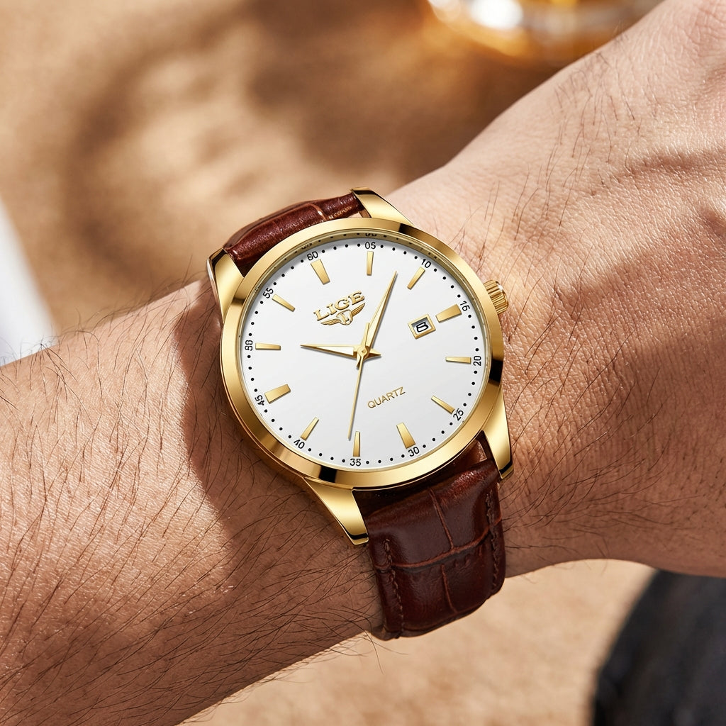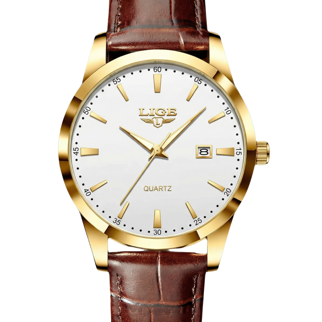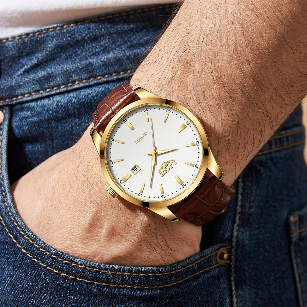 Executive Gold is designed for the modern gentleman who values timeless style and confident presence. Featuring a refined white dial accented with gold-tone markers, a polished gold case, and a rich brown leather strap, this watch delivers effortless sophistication. Powered by precise quartz movement with a clean date display, it’s the perfect finishing touch for business attire or elevated everyday wear.