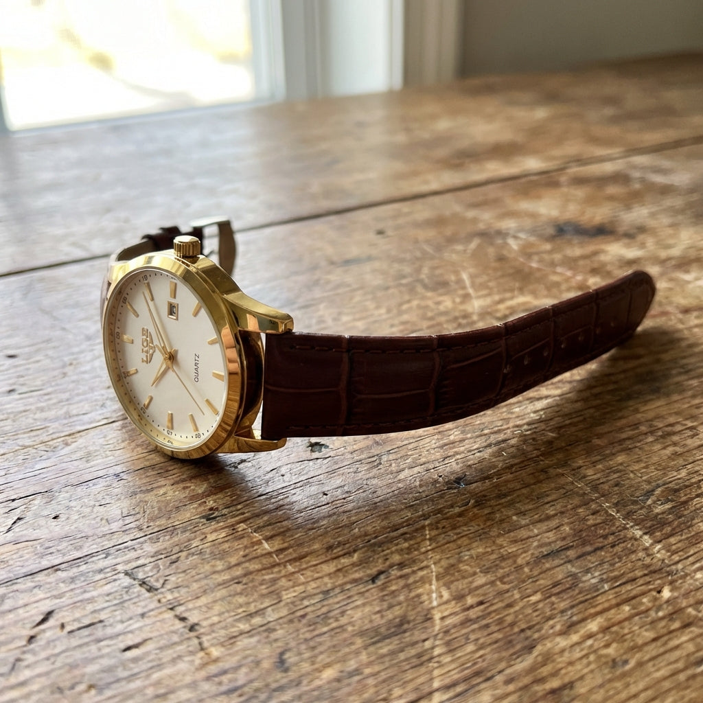 Golden Heritage is a tribute to timeless refinement. Featuring a pristine white dial accented by bold gold-tone markers and hands, this watch radiates classic sophistication. The polished gold case and rich leather strap complete its distinguished look, while precise quartz movement and a subtle date window ensure everyday reliability. Elegant, confident, and enduring—crafted for those who value tradition with a modern touch.