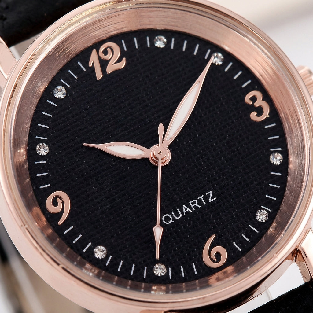 Crafted with a refined black leather strap, this watch embodies understated luxury and effortless sophistication. The smooth, tailored finish of the strap pairs seamlessly with the warm rose-gold accents, creating a timeless piece designed to elevate every moment with quiet elegance.